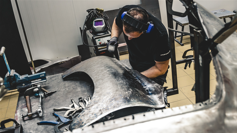 Waar mogelijk worden originele plaatdelen behouden en zorgvuldig hersteld. Indien vervanging noodzakelijk is, gebruiken we nieuwe delen volgens originele fabriekspecificaties. De lasnaden en afwerking worden volledig conform de originele Porsche afwerking uitgevoerd, voor een onzichtbaar en authentiek resultaat.